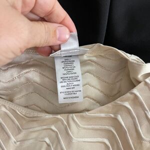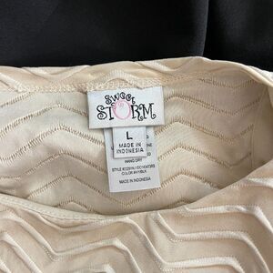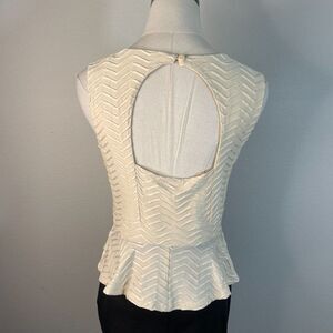 Chic mini dress by Sweet Storm. Cream textured top with a peplum detail. Sleek black skirt. Perfect for a night out.