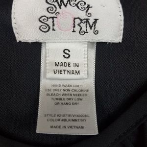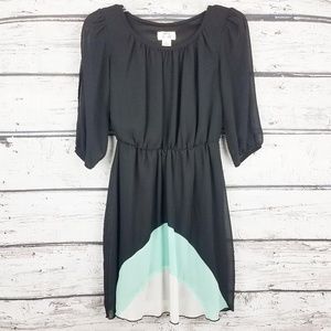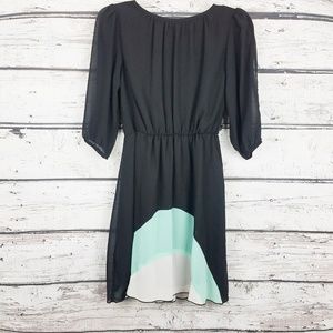 Gently used, Sweet Storm color block black dress with teal and white triangle aligned to the very middle of the dress.