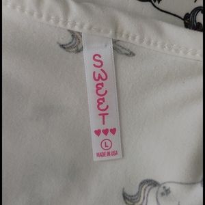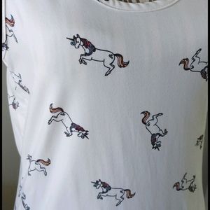 Worn once, great condion! Cute all-over unicorn print...matetial is slightly stretchy...unicorns are outlined in black and have pink, blue, yellow and light purple hair...Size L. 27.5" length, 16.5" pit to pit (measurements approximate, taken flat)