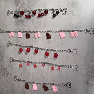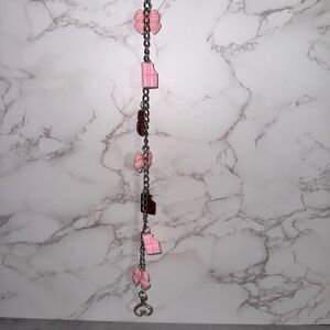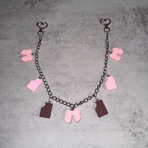 This handcrafted accessory features beautiful pink and brown chocolate bars with bow charms attached to a durable silver tone chain with heart-shaped clasps for easy attachment.