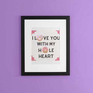 Introducing our 8x10 wall print with the endearing phrase "I love you with my hole heart," playfully adorned with a charming donut theme. This isn't just a print; it's a heartfelt declaration of love with a sprinkle of humor. Printed on high-quality material, it adds a touch of sweetness and brings a smile to any space.