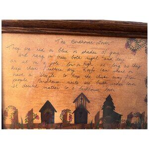 Framed vintage print with protective glass. Titled "The Birdhouse Lover," this nostalgic piece features a charming poem written in flowing cursive:
