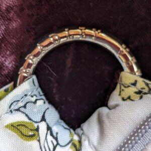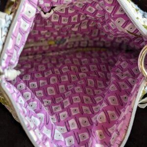 Vintage Vera Bradley Soft Shoulder Bag, clean, excellent gently used condition. Quilted 10" x 10" with adjustable shoulder strap. Watercolor line-drawing floral design with very pale muted celadon- green-wash background and pink, white and gray squares lining. All cotton, of course. Maker's tag on inside. Has three outer pockets, two of which are zippered, and three open pockets inside the main zippered compartment. All zippers work smoothly. All original hardware and ribbon zipper pulls. Gently used. No tears, smell, just a great soft bag for Vera Bradley fans.