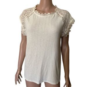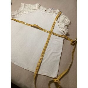 Excellent preowned condition, crochet lace sleeves, button back closure, tagged size L, See Measurements for Custom Fit