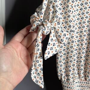 Cute blouse from Sweet Wanderer. White with blue and orange colors. Short sleeves with ties at the end. Round neckline with elastic towards the bottom of the blouse. Small keyhole in the back with one button.
