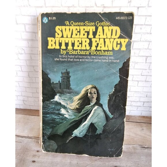 Vintage gothic romance paperback Sweet and Bitter Fancy by Barbara Bonham. A Queen-Size Gothic novel published by Popular Library. Classic 1970s gothic suspense set along the California coast, featuring dramatic illustrated cover art with seaside cliffs and a haunted hotel.