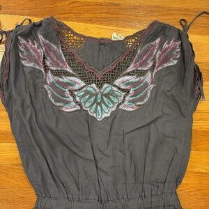 Sweet by Miss Me gray embroidered romper.  Fabric covered back buttons.  Elasticized waist.  Size S.  Measurements are 22” from armpit to armpit and 31” long.