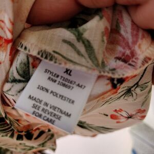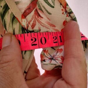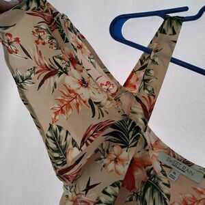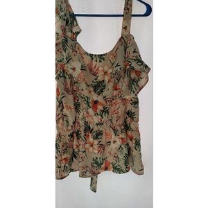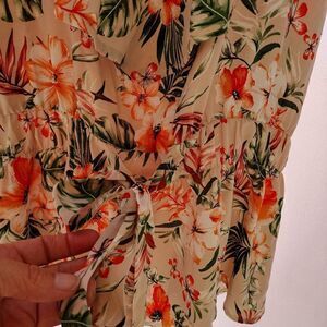 floral semi sheer, peek-a-boo shoulders, elastic waist with faux draw string. flowing and very feminine. pit to pit 20 " length 27"