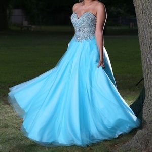 Long,aqua colored dress, sweetheart neckline, sequenced top. Perfect for a sweet16!