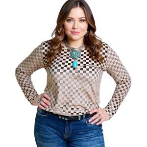 Turn heads with this bold and beautiful Sweet Dreams top, featuring a striking checkerboard pattern in soft velvet mesh. Designed with a classic crew neckline and long sleeves, this piece blends edgy style with luxurious texture. The breathable mesh and flattering fit make it perfect for layering or wearing solo. Whether you're dressing it up for a night out or adding flair to your everyday look, this top is a must-have for fashion-forward wardrobes.