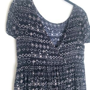 Sweet Rain (Nordstrom) size medium Black and Tan tribal print empire waist babydoll style with v- neck cross over back. Measurements are taken of the top laying flat: