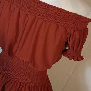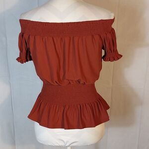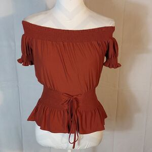This rust colored short sleeve Sweet Wanderer steam punk off the shoulder corset top is a size Small with a pit to pit measuring 18". In excellent condition. All offers are welcome.