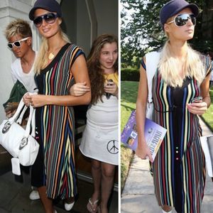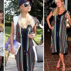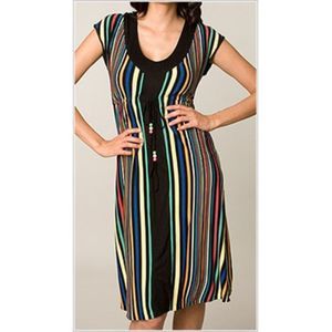 • Details: Black v-neck dress with contrast neckline and panel down front. Multi-color vertical striping throughout. Empire waist with drawstring. The fabric is silky soft, stretchy, falls flawlessly and hits just below the knees. Fun bead accents.