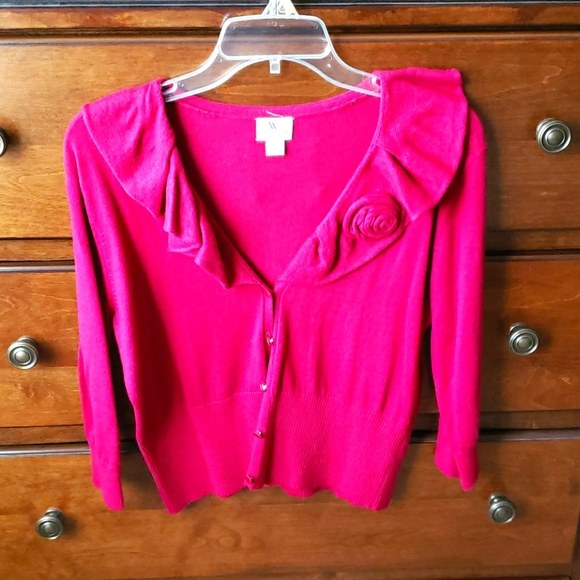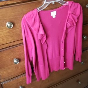 Raspberry Long-sleeved cardigan sweater flower on left side. very pretty and excellent condition. new