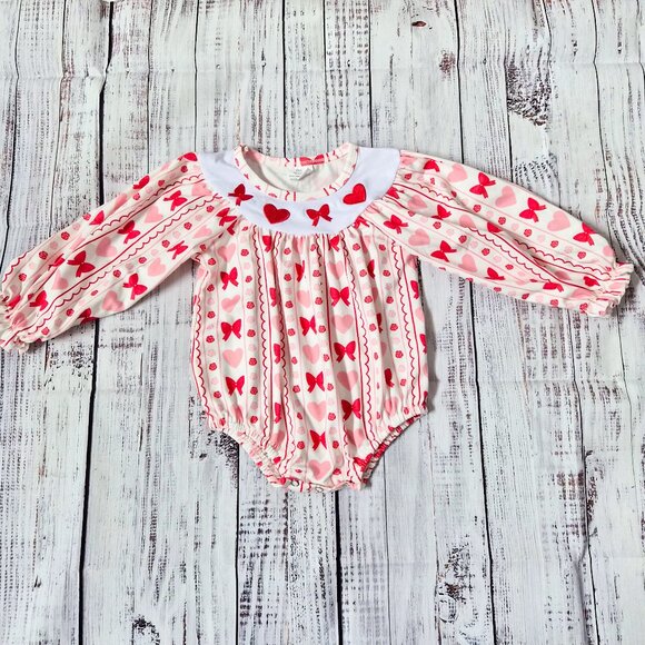 Pretty, playful, and perfect for little Valentine cuties! This long-sleeve romper features a sweet mix of hearts and bows with a classic white collar and embroidered details. Made from soft, breathable fabric with elastic cuffs for a comfy fit.