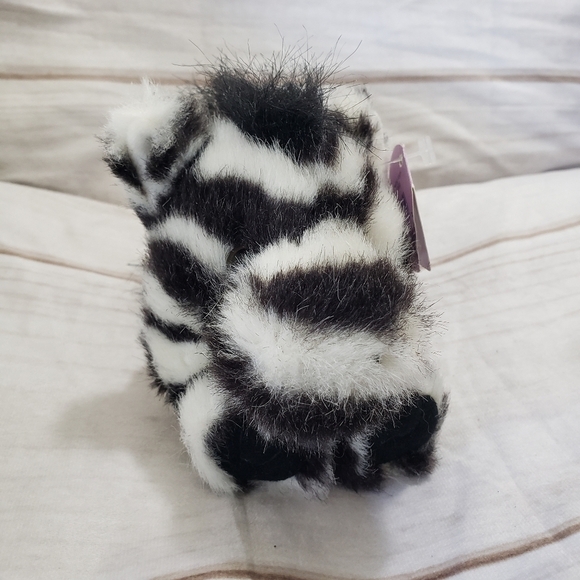 This adorable 4.5" beanbag plush stuffed animal from Swibco's Puffkins collection features Zack Zebra, a charming addition to any stuffed animal collection. Made in China in 1997, this mini-sized plush toy is recommended for ages 3 and up, making it suitable for kids and collectors alike. With its original tag still attached, it's a rare find for any Puffkins fan.