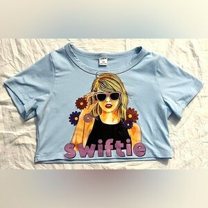 This stylish Swiftie crop top features a vibrant design perfect for young fans. The light blue color adds a fresh touch to any outfit.