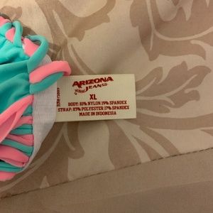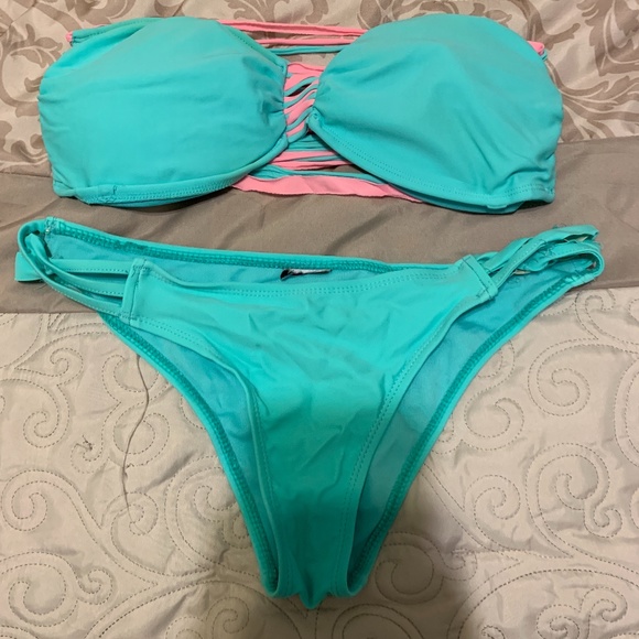 Teal bikini, strapless, comfy to wear. The back has fun straps all across the back