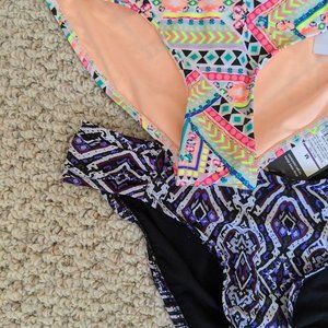 Purple and Black Patterns swim bikini bottom with stretch on sides. Brand new. Never worn. It still has inside tape and tag. Size M, but it seems more size S or someone between sizes.
