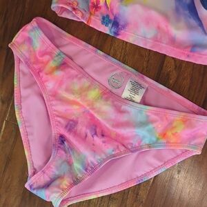 Colorful unicorn tankini with pink bottoms, and a blue polka dot one-piece with striped straps.