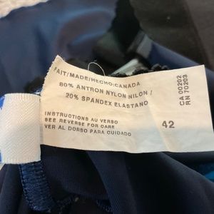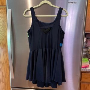 This swim dress may never have been worn. I can’t say for sure so maybe one time. Beautiful Navy with sleek accents. Modest yet stylish. Attached bottoms with full coverage flowing skirt. See size and brand in photos. You cannot beat this FIRM PRICE.