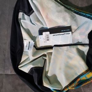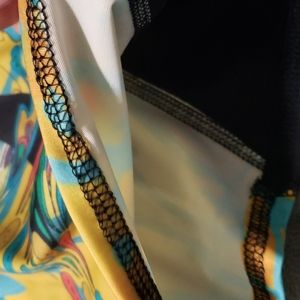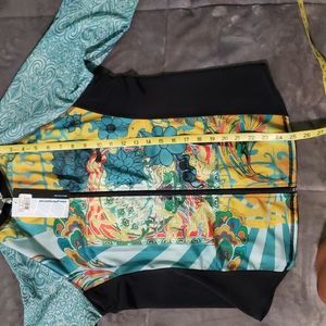 Full zip top with half sleeve bright colors. Matching shorts with drawstring, wear alone or over swim bottom. Provides sun protection, light warmth while at the beach, surfing, kayaking, paddle boarding or swimming. Small stitch loose at bottom front of top. Look closely at pictures as they are your best description.