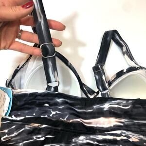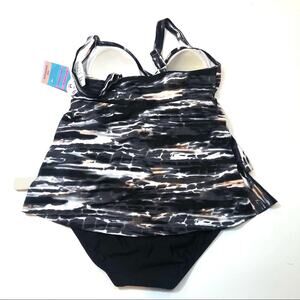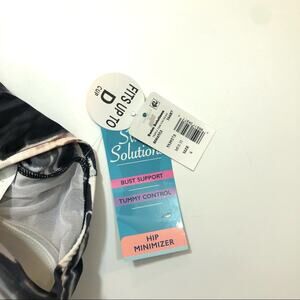 Deep tones create stylish waves across this Swim Solutions one-piece, a fresh look with floaty tiers at the front. Lined. Moderate bottom coverage. Non-removable cups. Pull-on styling; adjustable over-the-shoulder straps. Tiers at front. Tummy control; hip minimizer; bust support. V-neck.