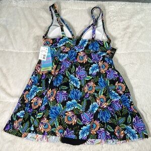 Flirty florals and slimming technologies combine on this ultra-flattering swimdress from Swim Solutions
