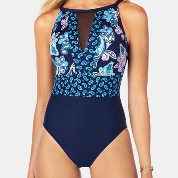 Keywords: Swim Solutions, One Piece, Tummy Control, Paisley Print, High Neck, Mesh Detail, Navy Blue, Plus Size, Macy's, Modest Swimwear, Summer, Beachwear, Resortwear