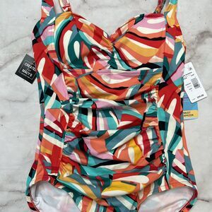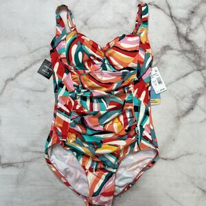 Swim Solutions PALM ART Shirred Tummy-Control One-Piece Swimsuit Size 10 Pink