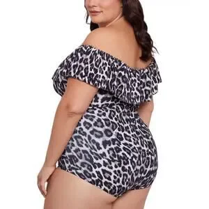Elevate your swim style with this bold and flattering Swim Solutions Off-Shoulder One-Piece Swimsuit in a dramatic cheetah-inspired black multi print. Designed for the modern, confident woman, this plus-size swimwear piece delivers both fashion and function.