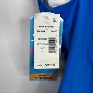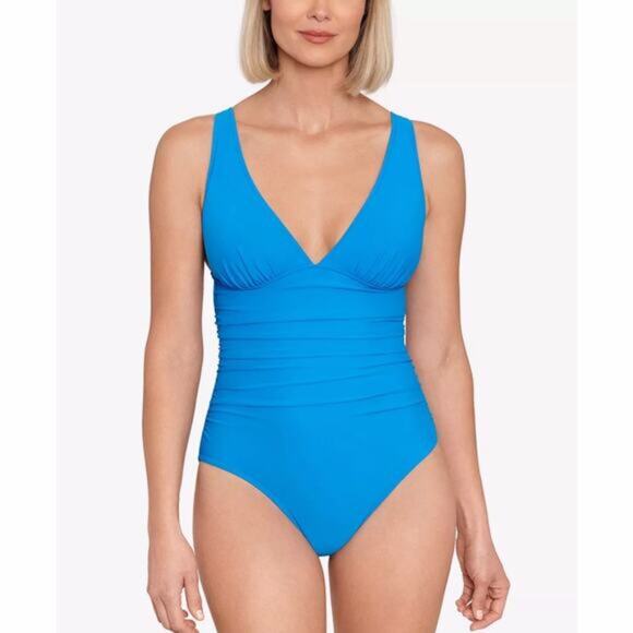 Swim Solutions Tummy Control Plunge One Piece Swimsuit in copen blue. A deep V-neckline and built-in tummy control for a smooth silhouette. Non-removable cups offer lasting support, while adjustable shoulder straps ensure a custom fit. With full bottom coverage and pull-on styling, this swimsuit blends comfort and confidence for your next swim.
