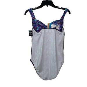 A vibrant explosion of color and a contemporary print freshen this one-piece from Swim Solutions. Shirring at the front helps smooth your silhouette.