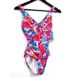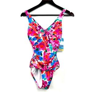 The Swim Solutions Twist Front Tummy Control Pink One Piece Swimsuit in Size 8 is a stylish and comfortable swimwear option for women. With a tank top style and wide straps, this suit features a floral pattern and tummy control accents for added confidence. Made from a blend of nylon and spandex, this one-piece swimsuit is designed for a comfortable fit and is perfect for a variety of beach or pool activities. The pink color and beachy theme make it a fun and vibrant choice for a vacation or lounging by the water.