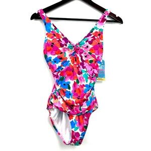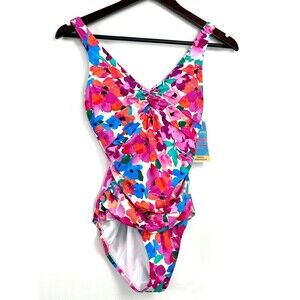 Swim Solutions Twist Front Tummy Control Pink One Piece Swimsuit Size 8 1047H3