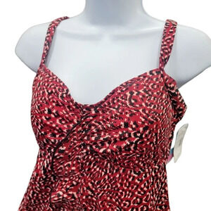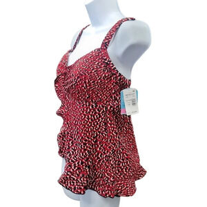 A vibrant print and sleeveless silhouette lend a fresh look to Swim Solutions' tankini top with ruffle trim at the front