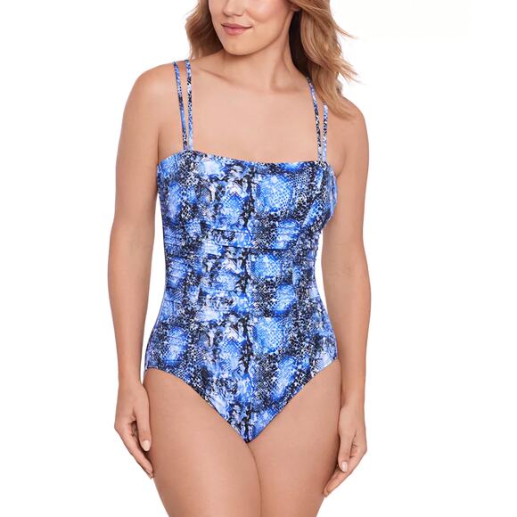 Make a striking statement at the beach or pool with the Swim Solutions Shirred Mio One-Piece Swimsuit. Featuring a dynamic snakeskin-inspired print in navy multi tones and expertly shirred sides, this suit offers a sleek, slimming silhouette with bold flair.