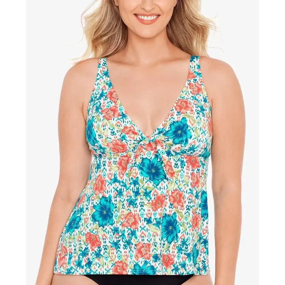 Vibrant blooms highlight an ikat print, bringing dynamic style to this Swim Solutions tankini top. A bow between the bust punctuates the sleek, tummy-control fit.