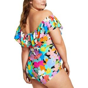 Swim Solutions Women's Off-The-Shoulder Floral Print Swimsuit Black, Size 22W