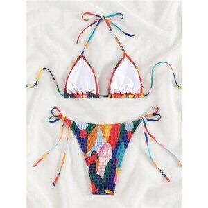 Swim Summer Beach Color Block Smocked Halter Triangle Bikini Set