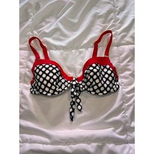 Swim Systems Bikini Set Black Red White Adjustable Strap Tie Back Size S-M Excellent Condition, no visible flaws Size: Top is Small, Bottoms are Medium Material: 82% Nylon, 18% Spandex. Lining 100% Nylon Circa: Modern Color: Black and Red with White spotted pattern Accents: Gold metal logo and waist band clasps Features: Adjustable straps with tie back Flat Lay Measurements: Pit to Pit - 12.5" Waist - 13.5"