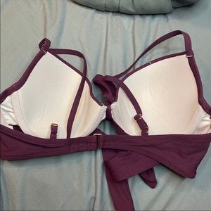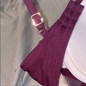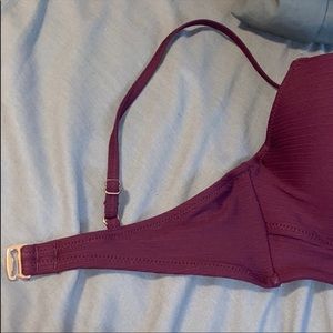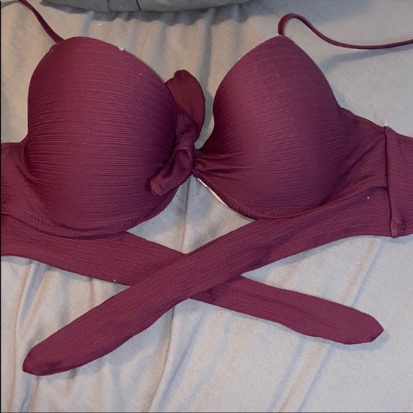 This maroon swim top, is vv cute. Has a tie in the front, with rose gold clips, and adjustable straps! Built in padding and underwire.