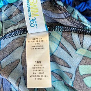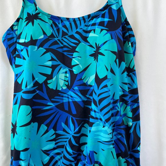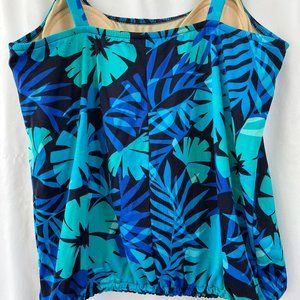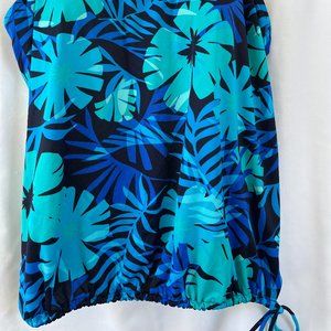 Very nice swim top that ties at the bottom in colors of blue, light blue, teal and blck.