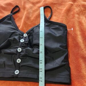 This is a black women's swim top in size small with front buttons and removable pads. It is a stylish and versatile piece that can be worn for swimming or as a fashion item.