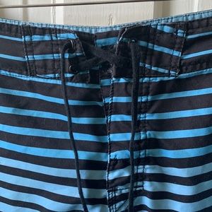 Blue and black ombré striped men’s swim trunks. Velcro on pocket is coming off but could be repaired easily.
