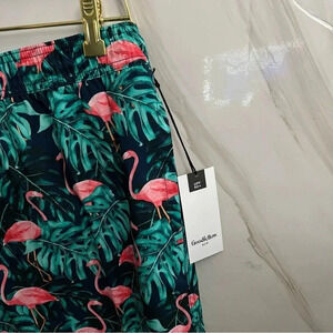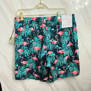 New, Goodfellow & Co UPF 50+ Swim Trunks Shorts Flamingos Print 7" Inseam, Color Navy Blue/Pink Green.