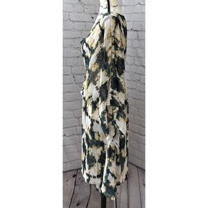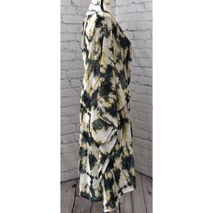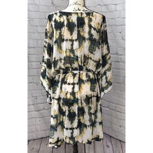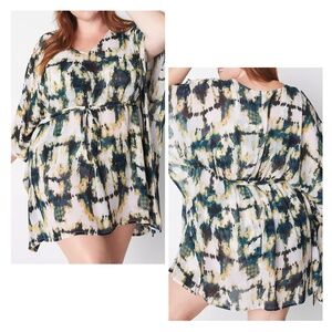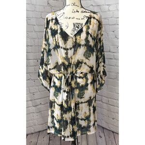 Enjoy your time on the beach or poolside in this breezy dolman-sleeve cover-up in lightweight chiffon from Lane Bryant. It has a V-neck, short dolman sleeves and a covered elastic drawstring waistband. Pattern is called Pebbles. It has blues, green and a dark cream tie-dye effect over a lighter cream color. I have the matching swim dress also listed in size 20.