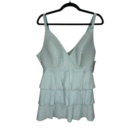 Swim by Cacique Women’s 14 Tankini Swim Top Seersucker Stripe Green Ruffle NEW