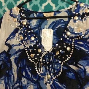 Blue with white, jeweled neckline beach cover up. 30 inches long. Great cover up for the end of sunny days. Brand new never been worn, with tags