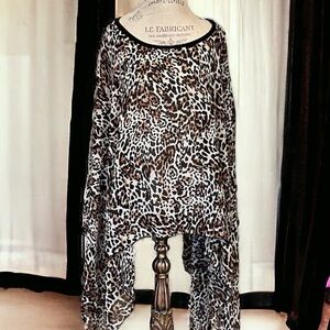 🐆 Swim cover up. Semi sheer poncho. Gorgeous light and airy Leopard print 1X-2X. Can be worn at the pool, at the beach, out for lunch. It’s just a great summer poncho, super light. Lands straight across waist. Depending on size of bust area. Super flattering. And flows down sides and lays beautifully. Has cut out holes with black trim for your wrists/arms. It’s a perfect poncho. Semi sheer.